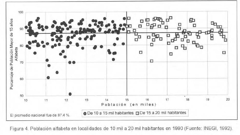 En el análisis de la población alfabeta, por tamaño de localidad, con datos de 1990, es interesante constatar que en localidades con población entre 10 mil y 15 mil habitantes, el 52.5% supera la media nacional que fue de 87.4%, lo que equivale a 85 localidades; en cambio, de las localidades entre 15 mil y 20 mil habitantes, sólo 40 de ellas (48.2%), estuvieron por encima de la media nacional (Figura 4; Cuadro 4).