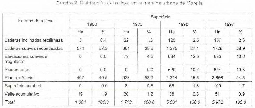 En 1960 la ciudad de Morelia se encontraba ubicada principalmente sobre laderas suaves redondeadas y sobre la planicie aluvial. En 1975, al crecer la mancha urbana, la mayor parte de la ciudad se localizaba en la planicie aluvial y en laderas suaves redondeadas (Cuadro 2).