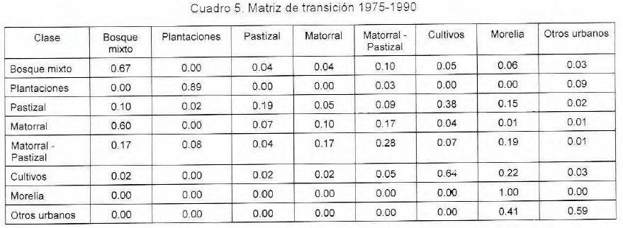 En la matriz de Markov correspondiente al período 1960 - 1975 (Cuadro 4), las categorías que tienen mayor probabilidad de permanecer en el tiempo son, en orden descendente: Morelia (1.0), otros urbanos (0.86) y cultivos (0.81).