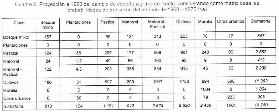 En la matriz de predicción realizada para 1990 (Cuadro 6) se observa que la superficie de cobertura de las clases bosque mixto, pastizal y cultivos tiende a decrecer. En cambio, las clases de plantaciones, matorrales, matorral-pastizal, Morelia y otros asentamientos urbanos aumentan su área.