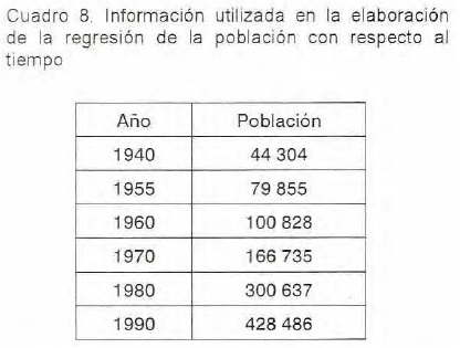 Con intención de generar un modelo más robusto y confiable que permitiera predecir el crecimiento de la ciudad de Morelia en el tiempo, se procedió a evaluar la relación entre las variables del tamaño de la población (x) y la superficie de la mancha urbana (y) mediante un análisis de regresión lineal simple. Para tal fin se realizó un análisis de regresión no lineal (exponencial) que permitiera generar un modelo simple que indicara el comportamiento de la población con respecto al tiempo (Cuadro 8).