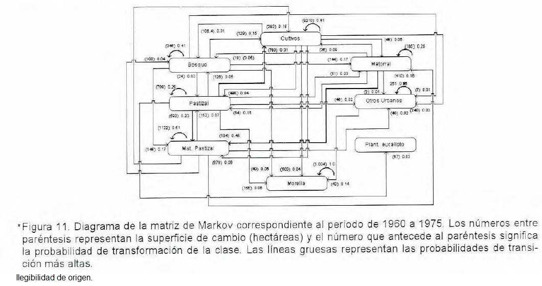 Al igual que en el período comprendido entre 1960 y 1975, las clases de pastizal, matorral y matorral-pastizal siguen comportándose de manera muy dinámica. El matorral tiene una probabilidad de 0.60 de convertirse en bosque y de 0.17 de pasar a matorral-pastizal. El pastizal, en cambio, tiene una probabilidad de 0.38 de pasar a cultivos y de 0.15 de convertirse en parte de la ciudad de Morelia (Figura 11).