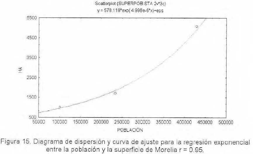 En este trabajo se prefirió utilizar el modelo de regresión lineal y no el exponencial por los siguientes motivos: en primer lugar, el comportamiento del crecimiento poblacional es exponencial y asumir que el crecimiento de la mancha urbana también se comporta con el mismo patrón de desarrollo, significaría que al realizar el modelo de predicción, entre dos variables que se relacionan de manera exponencial con la población, éstas tendrían una relación lineal. En segundo lugar, se considera que ante el reducido número de datos es preferible emplear modelos simples para realizar la predicción del crecimiento de la ciudad de Morelia.