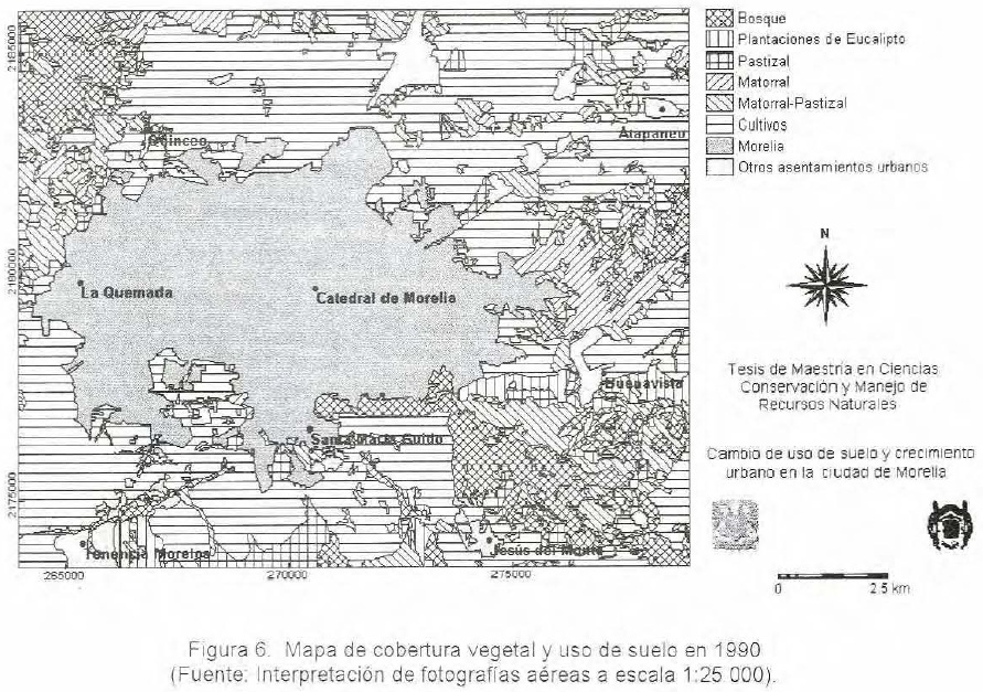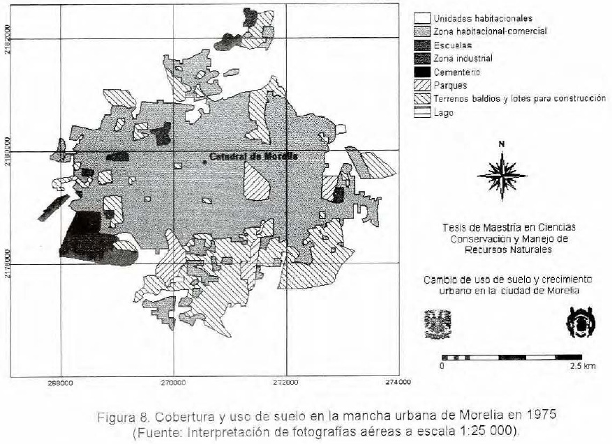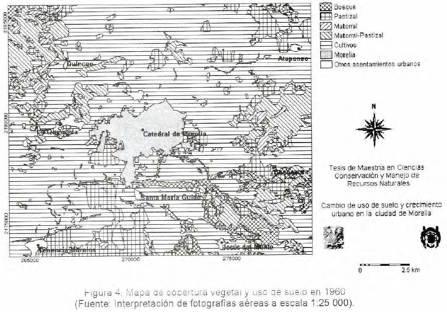 El cambio de uso de suelo más importante ocurrido en la zona en estudio es el incremento de la superficie de la ciudad de Morelia, que crece 506% entre 1960 y 1990. La clase aumenta su cobertura en función de la reducción de la superficie de las clases, otros asentamientos urbanos y cultivos y en las unidades de relieve de planicie aluvial, laderas suaves redondeadas y elevaciones suaves e irregulares. El mayor crecimiento que se ha dado dentro de la ciudad ha sido en las zonas habitacionales-comerciales, las cuales se han extendido de 790 ha en 1960 a 3 185 ha en 1990.