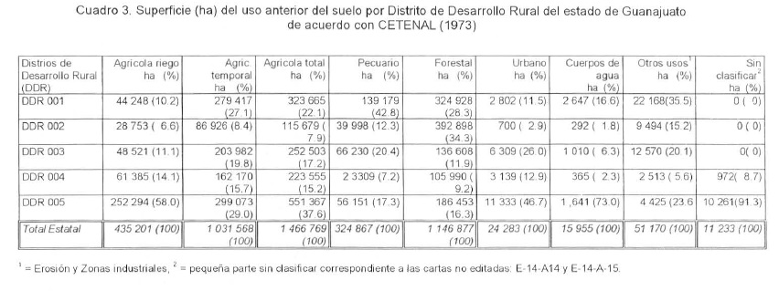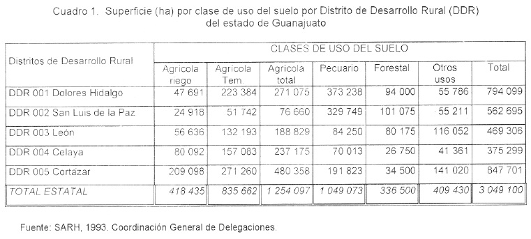 La SAGARPA cuenta con estadísticas de uso del suelo para el país, desagregadas por entidad federativa, DDR y municipios (SARH, 1993). En el Cuadro 1 se muestran las estadísticas de uso del suelo para el estado de Guanajuato y los cinco DDR que lo integran, las cifras totales de este cuadro indican que esta entidad se clasifica de la siguiente manera: a) 1 254 097 ha de agricultura, de las cuales 418 435 son de riego y 835 662 de temporal; b) 1 049 073 de uso pecuario; c) 336 500 de uso forestal, y d) 409 430 de otros usos.