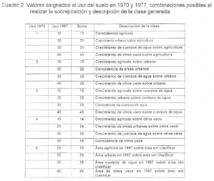 Para conocer la distribución espacial de los cambios generales registrados en el uso del suelo agrícola y su relación con otros usos, se sobrepusieron en el sistema IDRISI el uso del suelo a nivel de subsector relativo a 1970, agrupado en cinco categorías, pero con las clases de uso del suelo delimitadas para 1997. A las clases de uso del suelo en 1970 se les asignaron los siguientes valores: 1 = agrícola, 2 = áreas urbanas, 3 = cuerpos de agua, 4 = otros usos y 5 = sin clasificar. A las clases de uso del suelo en 1997 se asignaron los siguientes valores: 10 = agrícola, 20 = áreas urbanas, 30 = cuerpos de agua y 40 = otros usos. Posteriormente, estas imágenes se sobrepusieron sumando ambas capas de información, los resultados, de acuerdo con las combinaciones posibles, se presentan en el Cuadro 2.