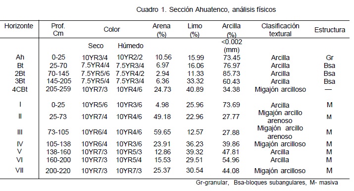 El color se determinó en seco y húmedo por comparación con las tablas de color Munsell (1990). El análisis granulométrico se realizó mediante el método de la pipeta, de acuerdo con Schlichting y Blume (1966), la separación del tamaño de partículas fue determinada después de destruir los agentes agregantes como carbonato de calcio, la materia orgánica con H2O2 y óxidos de hierro, con ditionito-citrato-bicarbonato (DCB).