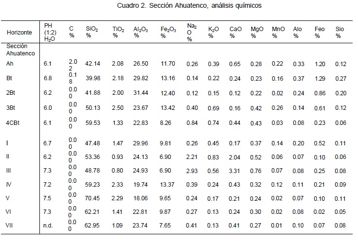 Por su parte, las capas IV y V muestran rasgos asociados a la pedogénesis, como son restos de material orgánico carbonizado, cutanes de arcilla, nódulo de Fe-Mn. El índice de intemperismo de Parker y bases son bajos, lo que indicaría una fuerte desbasificación, aunque esta consideración no es aceptable dados los valores de pH > 7.0 (Cuadro 2). Los valores de las relaciones Sa y Ses son muy altos, indicando que las capas quizá recibieron aportes secundarios de sílice, dando valores altos de hasta 70% (Cuadro 2). No obstante, no se encontraron evidencias ni en campo ni en láminas delgadas con sílice secundario (ópalo), rasgo común en los tepetates del centro de México, formados en clima subhúmedo (régimen de humedad ústico; Miehlich, 1992; Hessman, 1992). Además, los valores de sílice extraídos por oxalato de amonio (Sio) son bajos (0.9-0.11%; Solleiro et al., 2002), si bien la relación Sio/Alo es la mayor (1.46) de toda la secuencia (Cuadro 2). Esto permite pensar que el sílice procede del material parental de estas capas, que es de tipo volcánico ácido (riodacítico). Es importante señalar la influencia pronunciada de procesos de oxidación-reducción, evidenciados por valores altos de la relación Fma (0.44-0.34).