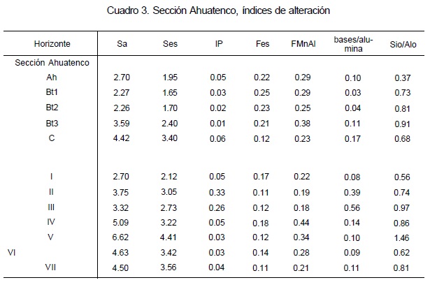 El índice de intemperismo de Parker (IP) muestra valores bajos en el luvisol, similares a los obtenidos para la relación bases/ alúmina (Cuadro 3). La relación Fes muestra valores altos que indican la presencia de amorfos de hierro en cantidades elevadas; mientras que el horizonte 4CBt muestra un patrón diferente, ya que los resultados de IP y las bases/alúmina son mayores, mientras que la proporción de amorfos de hierro es menor. La relación Fe2O3+MnO2/Al2O3 es marcadamente elevada, sobre todo en 3Bt, evidenciándose condiciones reductoras en el horizonte. En los tepetates los valores de IP son bajos en la capa I, y altos en la IV y V, notándose una acumulación de SiO2 en ellas. Los resultados de Ses en los tepetates es más heterogénea; el valor de Sa que coincide con la capa I, es bajo, mientras que en II, III IV, VI y VIl es más alto.