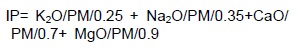 • índice de intemperismo de Parker (Colman, 1982). Este valor disminuye a medida que se pierden las bases del perfil. Por lo mismo, los valores altos reflejan etapas iniciales de desarrollo, mientras que los valores bajos implican que la mayor parte de los cationes se han perdido y ha actuado un intemperismo intenso en los suelos.