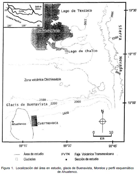 El glacis de Buenavista se ubica en la Sierra Madre del Sur (Subprovincia sur de Puebla), en el centro de México, a 85 km al suroeste de la Ciudad de México entre los 18° 45'-19° 00' de latitud norte y 99° 25'-99° 05' longitud oeste (Figura 1). El glacis ocupa una superficie aproximada de 331 km2 (Ortíz, 1978). Las altitudes varían de los 3 000 a los 1 100 msnm. El clima de la región es templado-húmedo, con una temperatura media anual de 20.7° C (García, 1988) y una precipitación anual de 1 147 mm, con régimen de lluvias de verano de 993 mm. La vegetación corresponde a bosques de Pinus y Quercus, en las partes más altas (>1 900 m) y a especies de sucesión secundaria, como los Juniperus (Rzedowsky, 1978); aunque en la actualidad, esta vegetación se ha visto disminuida por la presencia de actividad agrícola, así como debido al pastoreo; y se observa una intensa erosión que ha dejado amplias zonas denudadas.