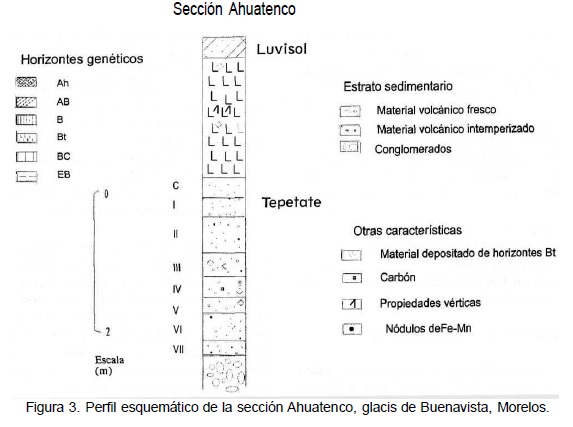 La sección estratigráfica de Ahuatenco está dividida morfológicamente en dos partes (Figura 3), la primera corresponde con un luvisol muy bien desarrollado poligenético y con perfil complejo, con tres horizontes Bt, que alcanza un espesor de 2.50 m; y la segunda está conformada por siete capas de tepetates, las cuales afloran en sitios donde se presenta erosión hídrica intensa. La base de esta sección está formada por una capa de conglomerados de la formación Cuernavaca, cuya edad probable es del Plioceno Superior (Fries, 1960).