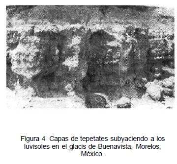 A study of tepetates found in the Glacis de Buenavista, Morelos is hereby presented. The section of study (Ahuatenco) includes a sequence of seven indurate horizons (tepetate layers), underlying a polygenetic and well-developed Luvisol. In this work tepetates are considered as products of erosion-sedimentation and pedogenetic processes. Therefore they are interpreted as paleosols with different degrees of development.
