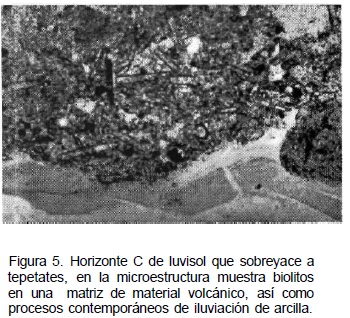 A nivel micromorfológico, es posible distinguir en el luvisol diferencias claras entre los tres horizontes Bt referidos. El primer Bt muestra una gran acumulación de arcilla, pero cutanes delgados y zonales, mientras que en el horizonte 2Bt los cutanes son gruesos y están deformados, observándose slickensides (cutanes de deslizamiento) y grietas. Por su parte, 3Bt tiene cutanes gruesos y continuos; en el horizonte 4CBt subyacente se observa una matriz formada por material volcánico, con un alto contenido de biolitos; la matriz y canales presentan gruesos cutanes (Figura 5). A nivel micro-morfológico los nodulos de Fe-Mn son comunes, principalmente en 2Bt y 3Bt.