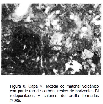 En la capa II de los tepetates son comunes los nodulos de Fe (Figura 6), mientras que en las capas IV yV es posible apreciar numerosas partículas de carbón (Figuras 7 y 8) y una mezcla de material volcánico fresco, restos de horizontes Bt retrabajados y cutanes de arcilla formados in situ (Figura 9).