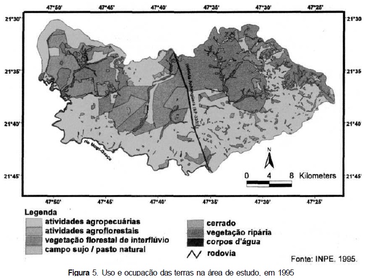O mapa de uso e ocupação das terras em 1995 (escala 1:50 000) foi produzido com base em um mapa prévio de uso e ocupação das terras da mesma área, feito com base em fotografias aéreas datadas de 1988 (Shida, 2000). Para a atualização do mapa prévio, usou-se a imagem digital do satélite LANDSAT-TM, bandas 3, 4 e 5 do dia 22/08/1995 e aferição em campo, além de comparação com o levantamento feito pelo Instituto Florestal (IF, 1993).
