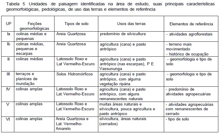Seis unidades de paisagem (UP) foram distintas na área de estudo (Figura 6): UP-I, UP-II, UP-III, UP-IV, UP-V e UP-VI, sendo a UP-I subdividida em duas. Na Tabela 5, as unidades de paisagem delimitadas encontram-se relacionadas com as feições geomorfológicas, tipos de solo e usos das terras predominantes, bem como com os respectivos elementos de referência.