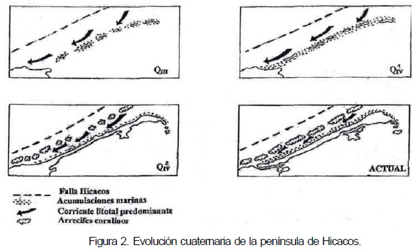 Durante el Cuaternario, a lo largo de la falla Hicacos se manifestaron movimientos tectónicos verticales diferenciados, los cuales determinaron contrastes geomorfológicos en los elementos del relieve submarino de la plataforma insular, con la formación alineada, siguiendo el sentido de la falla, de pequeños cayos e islas en su sector frontal, los cuales durante la etapa pleistocénica tardía y holocénica de la evolución, fueron unidos a la isla de Cuba por los procesos acumulativos marinos (Figura 2). Estos depósitos se estabilizaron bajo evidente tendencia emergente de la región, la protección y defensa de la vegetación de los complejos de costa arenosa y de manglares, así como se enriquecieron por los aportes biogénicos de las comunidades coralinas y las algas calcáreas, productoras de arenas.