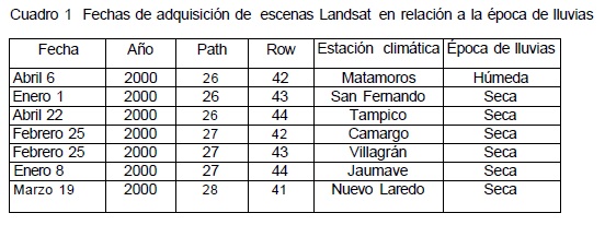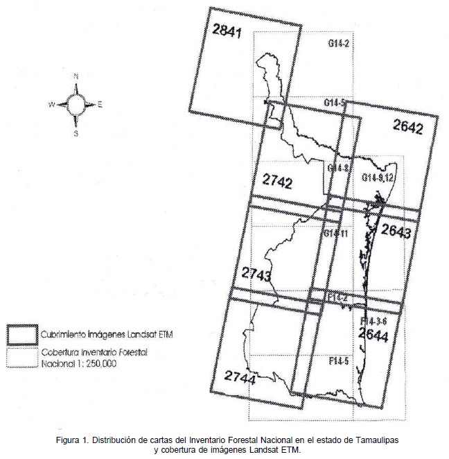 La identificación de los cuerpos de agua interiores del estado de Tamaulipas se llevó a cabo mediante el procesamiento digital de siete imágenes Landsat ETM (Enhanced Thematic Mapper) del año 2000, que cubren la totalidad de la entidad así como una pequeña parte del estado de Nuevo León, mientras que la información sobre el tipo de cobertura presente alrededor de los humedales se obtuvo a partir de la cartografía digital 1:250 000 del Inventario Forestal Nacional 2000-2001, el cual utiliza la misma distribución temática y nomenclatura de identificación de cartas del INEGI (Figura 1).