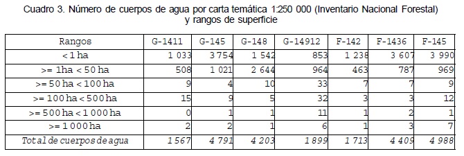 Las estadísticas de cuerpos de agua obtenidas se presentan en el Cuadro 3. Puesto que los datos generados fueron integrados en un mosaico que siguió la distribución de la cartografía del Inventario Nacional Forestal, se utilizó la clave de la carta para facilitar la interpretación y ubicación geográfica de los datos y se aplicó un sistema arbitrario de clasificación por rangos de superficie de dichos cuerpos de agua, sin tomar en cuenta el tipo de humedal. Al observar los datos del Cuadro 3 se aprecia que, a excepción de las zonas correspondientes a la carta G-14912 y G-148 correspondientes a la mitad de la parte costera del estado y a una zona del norte de la entidad y del estado de Nuevo León (Figura 1), la mayoría de los humedales interiores fueron menores de una hectárea. De un total de 23 570 cuerpos de agua interiores, aproximadamente el 68% tiene menos de 10 000 m2 de extensión. En segundo orden de importancia aparecen aquellos humedales mayores a una hectárea pero inferiores a 50 ha, lo que da idea de la cantidad de pequeños almacenamientos hechos por los agricultores en todo el estado de Tamaulipas y de Nuevo León.