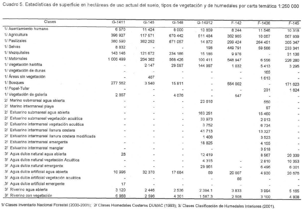 Se contó, además, con la información de humedales costeros, obtenida a partir de un trabajo de clasificación digital con escenas Landsat de 1993 realizada por DUMAC (Ducks Unlimited de México A.C.), el cual se concentró exclusivamente en el sistema de lagunas maréales e intermareales del estado de Tamaulipas El nivel de información requerido para la evaluación de los hábitats de humedales interiores contempló sólo grandes grupos de vegetación y usos generales del suelo, por lo que se efectuó una recodificación y disolución de polígonos de las clases originales de la cartografía de usos del suelo y vegetación del Inventario Forestal Nacional, resultando las siguientes asentamientos humanos, agricultura, pastizales, selvas, mezquitales, matorrales, vegetación halófila, vegetación de dunas, áreas sin vegetación, bosques y vegetación de galería. El sistema de clasificación de humedales utilizado en el proyecto es una modificación del desarrollado por Cowardin et al. (1979; Cuadro 2), tomando sólo en cuenta los humedales de agua dulce interiores, ya sean naturales o artificiales, excluyendo los humedales marinos y estuarinos de la costa tamauhpeca, ya que no constituyen el objetivo de este trabajo. Sin embargo, es conveniente mencionar que la información sobre la situación presente de estos hábitats en el estado está siendo desarrollada actualmente por DUMAC.