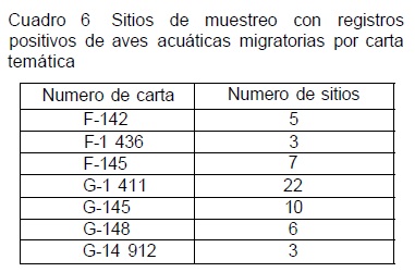 Para determinar los tipos de cobertura presentes alrededor de los humedales identificados como probables sitios potenciales de conservación, debido a la preferencia de uso por aves acuáticas migratorias indicadoras (gansos y patos), se procedió a generar nuevas coberturas de puntos únicamente en aquellos sitios que reportaron presencia, actual o histórica, de dichas especies. En el Cuadro 6 se presenta el número de sitios detectados por carta y a partir del código de identificación de cada punto de muestreo se eliminaron todos aquéllos que no reportaron presencia de gansos y patos.