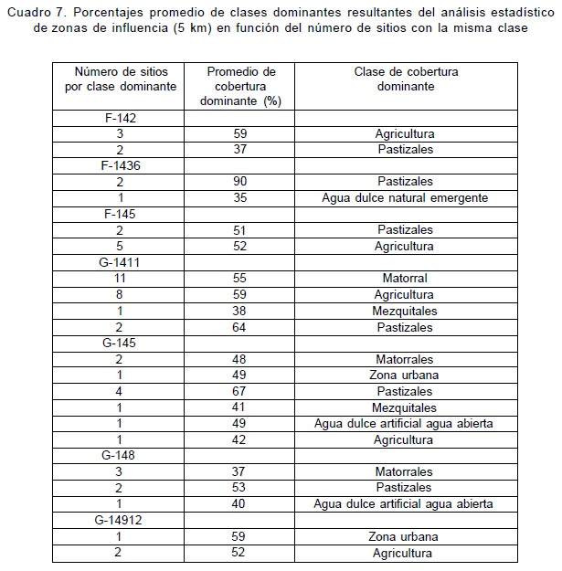 Esta situación fue similar para los tres casos en los que el número de aves acuáticas migratorias fue mayor a 5 000 A manera de síntesis, en el Cuadro 7 se presenta el porcentaje promedio de cobertura de la clase dominante obtenido en función del número de sitios con avistamientos positivos que tuvieron la misma clase De los 56 sitios que reportaron la presencia de patos y gansos, la agricultura fue la clase dominante en 17 de ellos, seguida en segundo lugar por los matorrales con 16 sitios, mientras que en tercer lugar la clase pastizales