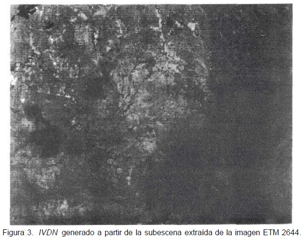 Generalmente, la banda infrarrojo cercano centrada en el rango de longitud de onda 0.750-0.900 micrones es la más utilizada para la generación del WDN cuando el objetivo es la evaluación de biomasa en coberturas vegetales, pero, dado que el interés del proyecto se centró en la obtención de las superficies con cuerpos de agua o suelos semi-inundados, la banda infrarrojo medio con un rango espectral de 2.090-2.350 micrones (banda 7) fue ideal para la discriminación del contenido de humedad en suelos. Algunos trabajos reportan la utilidad de cambiar el canal cercano infrarrojo por el infrarrojo medio en la elaboración de índices de vegetación (Nemani et al., 1993:25192522). El IVDN se caracteriza por un comportamiento asintótico con incrementos por la densidad de hojas verdes, sus valores van de -1 a +1, con un usual rango de -0.75 a +0.75 (Thiam y Eastman, 1999:117-118). Una alta actividad fotosintética resultará en altos valores del índice, de lo cual a su vez se infieren altas cantidades de biomasa verde. Bajos valores ocurren para áreas con poca vegetación, un valor de 0 representa un valor aproximado a la no vegetación, por consiguiente, valores negativos indican áreas sin vegetación.