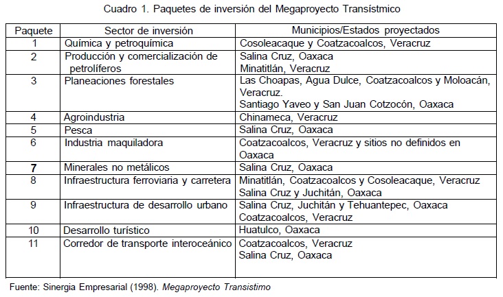 Conformado por 64 proyectos agrupados en 11 paquetes considerados como detonadores para la región por los gobiernos estatales involucrados, este programa requería de una inversión de 19 mil millones de pesos para generar, en un plazo no mayor a cinco años, 11 mil empleos directos (La Jornada, 19 de octubre de 1996:8). Los proyectos se orientaron a la necesidad de crear el sistema multimodal transístmico, la privatización de la petroquímica, un plan de desarrollo forestal, el establecimiento de una planta automotriz y el mejoramiento de las comunicaciones, con la finalidad de concentrar algunas etapas de las cadenas productivas mundiales, integrar las costas del norte y sureste del país y, posteriormente, constituirse como un corredor transístmico para el cruce interoceánico de mercancías (Cuadro 1).
