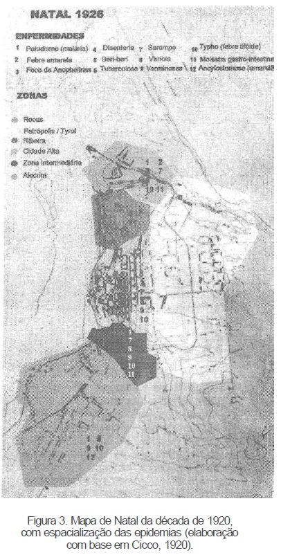 Os bairros de Petrópolis e Tirol, fruto de uma intervenção urbanística ocorrida em 1904, eram considerados, na Topografia, os pontos mais saudáveis de Natal, não apresentando patologias consideráveis em suas localidades (Figura 3). As avenidas largas, o solo arenoso e a disposição das ruas aos ventos dominantes, são alguns dos aspectos que o médico julgou como responsáveis pelas boas condições de salubridade das duas áreas, confirmando, assim, a dicotomia entre a cidade "antiga" e a cidade planejada dentro dos princípios higienistas. Apesar de indicadas algumas soluções pontuais, Januário Cicco concluiu enfatizando, como imprescindível, a construção de uma rede de esgoto, alegando que esse serviço tornava-se indispensável para uma região constituída por uma população maior que dois mil habitantes, como pode ser visto a seguir: