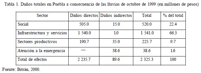 En el estado de Puebla fueron 87 los municipios afectados, y en mayor grado 49 de ellos; entre estos últimos está Zacapoaxtla. Las pérdidas económicas se estimaron, en todo el estado, en más de 2 300 millones de pesos (Tabla 1). Los sectores más dañados fueron la infraestructura y los servicios. Los daños a la infraestructura se manifestaron principalmente en las vías de comunicación (particularmente la carretera interserrana), el sector eléctrico, la distribución de agua potable, la vivienda y la agricultura, en donde se estima se perdió cerca del 30% de los campos.