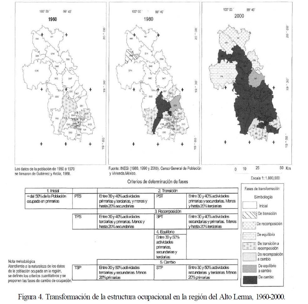 La transformación de la estructura ocupacional de la población se explica por el proceso de urbanización, por el abatimiento del analfabetismo y el incremento de los niveles de instrucción en la población rural, así como por el declive de las actividades agropecuarias, lo que ha conducido a la búsqueda de otras alternativas de trabajo. El resultado es la conformación de un patrón ocupacional heterogéneo, caracterizado por un tránsito relativamente corto hacia etapas de transición hasta trasformar la estructura ocupacional a favor de las actividades secundarias y terciarias.