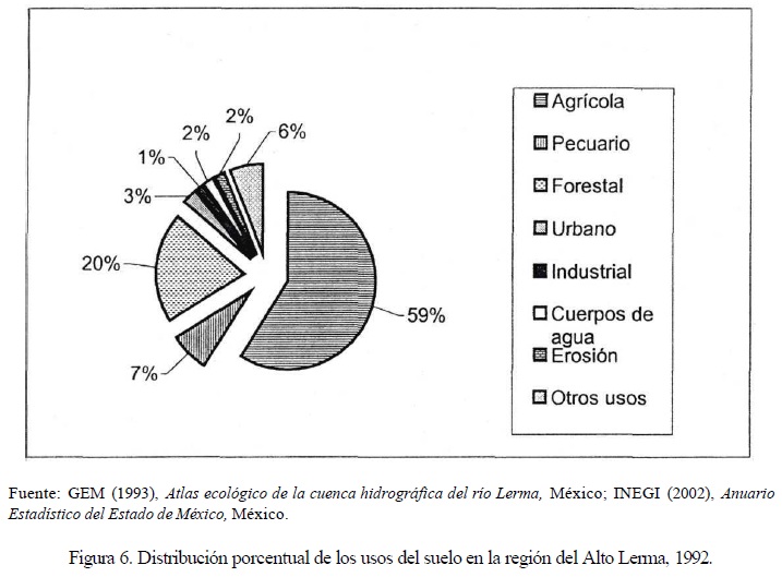 De 1985 al año 2000, la extracción y conducción de agua hacia la Ciudad de México se ha reducido a nueve y seis m3/seg./día, respectivamente, como resultado del abatimiento de los mantos freáticos que alimentan a los manantiales que dan origen al río Lerma (Peña et al., 2002). Actualmente, el mermado cauce del río Lerma, a lo largo de su trayectoria por el Estado de México, se ha convertido en un canal de aguas negras, pues recibe 75% de las descargas y 86% del volumen de aguas residuales de la entidad. Los sectores de origen de las descargas son principalmente el doméstico, de servicios, industrial y agropecuario (INEGI, 2000).
