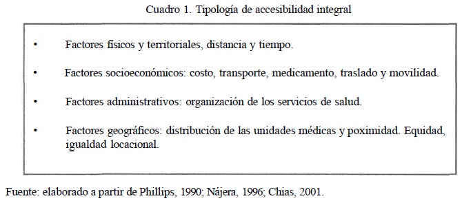 Los factores que influyen en la utilización y acceso a los servicios de salud se pueden integrar en cinco grupos: económicos (niveles de ingresos), sociodemográficos (sexo y edad), geográficos (distancia física y relieve), socioculturales (educación), y organizacionales (administración y gestión de los servicios); por lo tanto, se puede entender que la concepción de accesibilidad se ubica en un contexto integral, es decir, lo territorial (accesibilidad física) y lo social (todos aquellos indicadores socioeconómicos; Phillips, 1990), lo anterior, sugiere una tipología de accesibilidad integral en la cual convergen diversos factores (Cuadro 1).