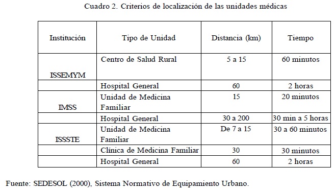 Los criterios de localización de las unidades médicas están en función de la distancia y el tiempo (Cuadro 2), y no en función del tamaño de la población usuaria de cada institución; este criterio de localización es un factor más que limita la accesibilidad, es decir, es un factor de obstaculización o bien de no-accesibilidad.