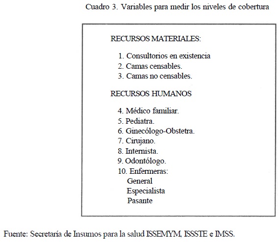 La Dirección de Regulación Sanitaria a través del Departamento de Servicios e Insumos para la Salud, de la Secretaría de Salud del Estado de México, cuenta con una regionalización de regulación sanitaria. La regionalización comprende 18 jurisdicciones, de las cuales se ocuparon seis para este estudio: Zumpango, Teotihuacan, Cuautitlán, Texcoco, Nezahualcóyotl, Chalco; y algunos municipios que pertenecen a otras jurisdicciones, pero que se abstrajeron de otras jurisdicciones para complementar el área de estudio, ya que son municipios que se ubican en la zona metropolitana, como son Tlalnepantla, Naucalpan, Atizapán de Zaragoza, Huixquilucan y Coacalco. Municipios y jurisdicciones que están utilizados por el ISSEMYM. Para medir la cobertura, o bien, la disponibilidad tanto de los recursos humanos como de los recursos materiales que ofrece el ISSEMYM, se tomaron las siguientes variables que se presentan en el Cuadro 3.