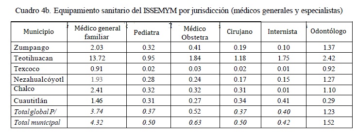 Nivel Regional. En el nivel regional o por jurisdicción existe inequidad en cuanto al suministro de recursos humanos y materiales. Primero, se tiene que la jurisdicción de Teotihuacan cuenta con una sobrecobertura, ya que rebasa el promedio global regional, al igual que el estatal de cobertura por cada 1 000 habitantes tanto para recursos humanos como para materiales, es decir, presenta un índice de cobertura de 3.64%.6 En contraste, las jurisdicciones que presentaron una subcobertura fueron Nezahualcóyotl, Cuautitlán y Texcoco, ya que presentaron una diferencia inferior pero muy cercana al promedio global.7 En cambio, la jurisdicción de Zumpango podría decirse que cuenta con una cobertura regular, ya que fue ligeramente superior al promedio en cuanto a consultorios en existencia. En cuanto a camas censables, todas las jurisdicciones presentaron un índice de cobertura muy inferior del total regional, esto es, menos de 5.00 % en promedio, cuando el total es arriba de 60%. Segundo, hay jurisdicciones que en su interior presentan desigualdades con respecto a las variables descritas, es decir, que reportan niveles de cobertura alta en recursos materiales, pero niveles de cobertura baja en recursos humanos, lo que significa que existe una heterogeneidad muy marcada en el suministro de equipamiento de servicios de salud (Cuadros 4a y b).