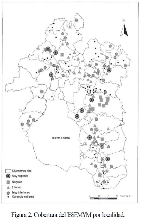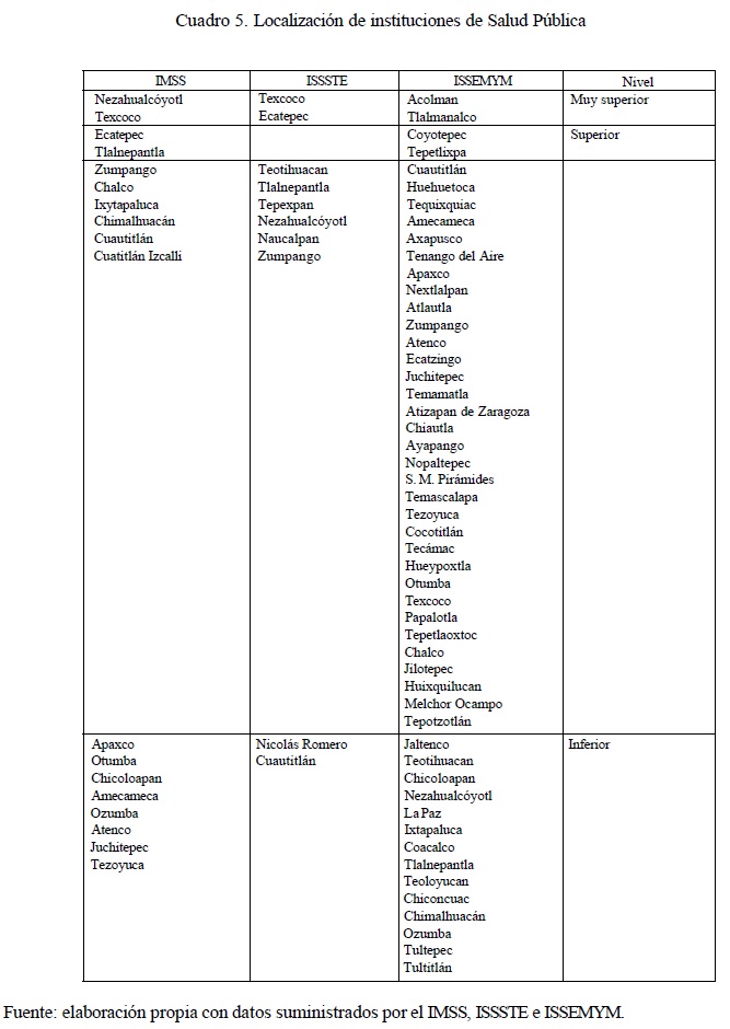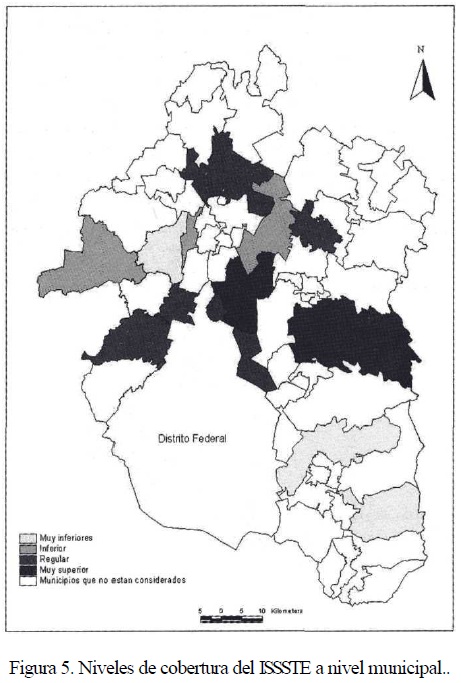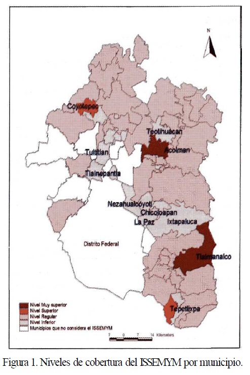 Para la elaboración de los mapas, se utilizaron diversas fuentes de información: la suministrada por el IMSS que fue a nivel municipal, así como por la que dispuso el ISSSTE. Para el ISSEMYM la información suministrada fue a nivel localidad. La metodología utilizada se basó en propuestas similares para medir la cobertura, y se tomaron en cuenta variables que fueron agrupadas por Laurell y Ruiz (1996:69).4