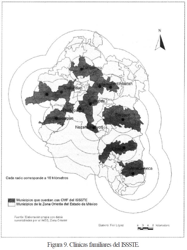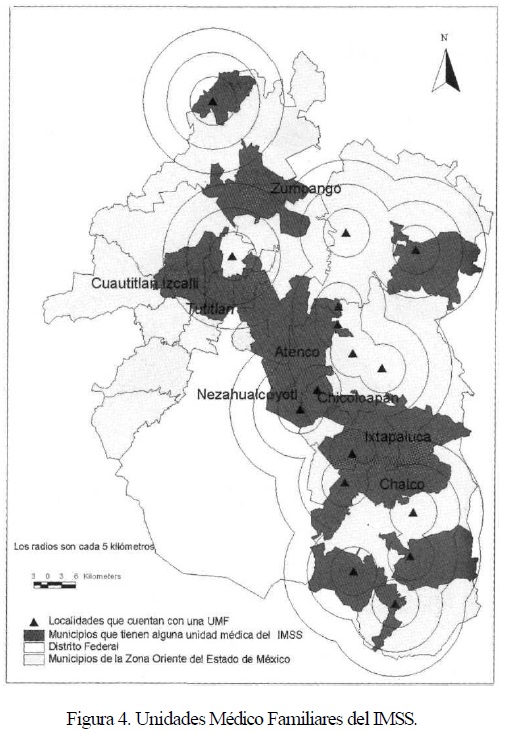 En la Figura 9 se observa que las unidades médicos familiares están establecidas en las cabeceras municipales (de acuerdo con lo establecido por el IMSS), con población atendida que va de 15 mil habitantes hasta los 200 mil.9 Se muestra también que, a pesar de que una unidad médico familiar es un servicio de primera atención (contacto directo con el paciente), se nota que el radio fragmenta cada 5 km a los municipios; también aquí se aprecia que la accesibilidad de una localidad está incluida en el último radio (15 km; Figura 9).