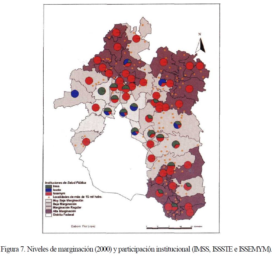 Existe mayor coincidencia de presencia entre el ISSSTE y el IMSS; en cambio, el ISSEMYM tiene una distribución no tan concentrada, sino más dispersa, lo cual se muestra con el grado de difusión de su infraestructura en más localidades, lo que amplía su espacio de cobertura. En este sentido, la concentración espacial de las unidades médicas en áreas urbanas, refleja la carencia de concepción territorial de las políticas de salud, de ello se deriva la inequitativa distribución de los servicios médicos.