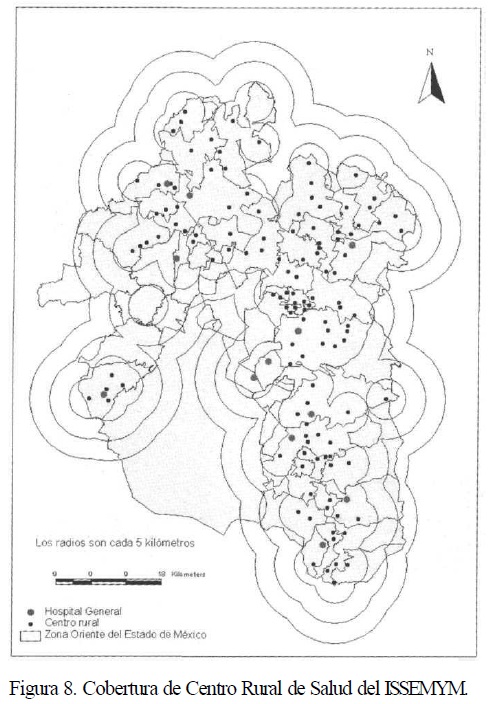 En cambio, para un centro de salud con hospitalización (CS/H) se requiere de uno a tres consultorios para atender a una población de 18 000 habitantes; sin embargo, el ISSEMYM únicamente cuenta con tres centros en su tipo (de los 51 municipios de estudio y 281 localidades); incluyendo solamente las localidades situadas dentro del radio de servicio regional (de 5 a 10 km), como sucede en el municipio de Teotihuacan con más de tres consultorios, y una población de menos de 5 000 habitantes; al igual que con Atizapán de Zaragoza y Jilotepec, estos últimos ubicados en los niveles regulares, es decir, con subcobertura. Por otro lado, los hospitales generales requieren de un radio de servicio de 60 km, cuyo servicio urbano recomendable es la ciudad.