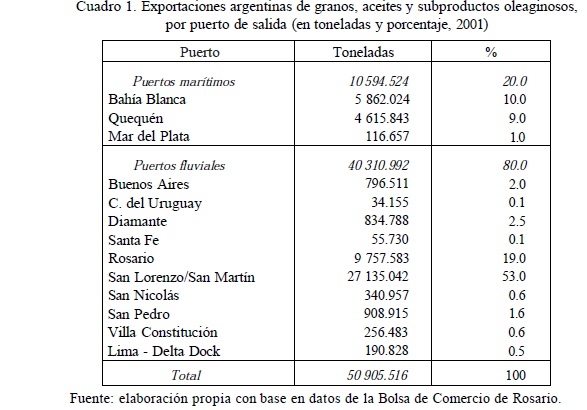 Durante el 2001, las exportaciones de productos y subproductos de origen agropecuario se canalizaron mayoritariamente (80%) por los puertos fluviales, principalmente por el puerto San Lorenzo-San Martín (53%). Mientras que por los puertos marítimos se exportó el 20% restante. Dentro de estos últimos, por el puerto de Quequén se embarca el 44% del volumen total exportado de granos, aceites y subproductos oleaginosos que se realiza a través de los puertos marítimos (Cuadro 1).