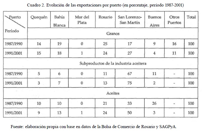 La extensión de las zonas de producción agrícola en Argentina junto con la posibilidad de canalizar la producción por distintos puertos localizados sobre el litoral marítimo, define un patrón de especialización y competencia entre puertos. En el Cuadro 2 se comparan la evolución de las exportaciones de granos, subproductos de la industria y aceites a través de los principales puertos argentinos, antes y después de la privatización de los mismos.