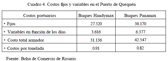 En el Cuadro 4 se transcriben los costos fijos y variables para el armador en 1999 en el puerto Quequén para un buque Handymax y un Panamax, considerando que un buque Handymax posee una capacidad de carga estimada de 33 000 toneladas y un Panamax puede salir de este puerto calando en función del cubicaje, 40 pies y cargando 52 000 toneladas de carga.