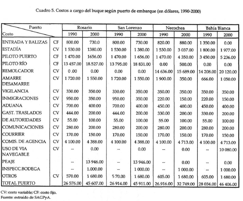 En el Cuadro 5 se comparan los principales costos que deben afrontar los propietarios de los buques antes y después de la privatización en puertos graneleros argentinos. Según SAGPyA (2000), si bien los valores nominales de los costos entre 1990 y 2000 han crecido notablemente en todos los puertos, se debe considerar que la posibilidad de embarcar con superior velocidad, por el incremento de la capacidad del ritmo de carga y almacenaje de los puertos, la mayor amplitud de la bodega de los buques y la eliminación -gracias al dragado- de un puerto de completamiento que permiten la reducción del tiempo de estadía de las naves.
