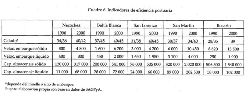 En el Cuadro 6 se compara una serie de indicadores que definen la eficiencia de un puerto, tales como: calado, ritmos de carga y capacidad de almacenaje, en el período anterior y posterior a la privatización para los principales puertos de exportación de productos agropecuarios. Para el cálculo de los mismos se toma en cuenta el conjunto de terminales existentes en cada uno de los puertos.