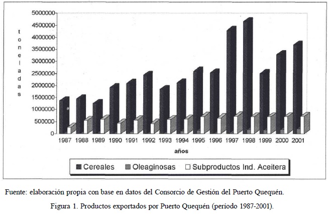 Las cargas con destino al exterior a través del puerto Quequén muestran una tendencia creciente al pasar de 2.5 millones de toneladas a mediados de los ochenta a 4.5 millones en el 2001.