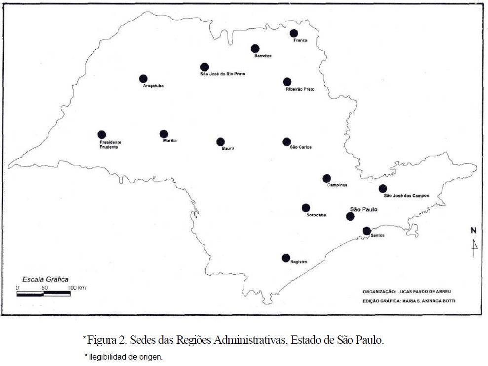 Na Figura 2, temos a representação cartográfica das sedes das regiões administrativas do Estado de São Paulo, o que ajuda a formar o quadro das cidades médias que compõem a rede urbana paulista. Destaca-se a cidade de Registro que sedia as atividades administrativas no sul do Estado de São Paulo, área de menor desenvolvimento econômico, na qual a renda per capita é mais baixa, o que explica porque esse centro urbano tem sido pouco atraente para os grandes capitais comerciais e de serviços. Destacam-se, ainda, Barretos e Franca, ambas em regiões de grande desenvolvimento econômico, mas relativamente próximas de centros regionais mais importantes (São José do Rio Preto e Ribeirão Preto) com os quais rivalizam no desempenho de seus papéis intermediários, o que nos permite classificálas como cidades médias de menor importância que as citadas anteriormente.