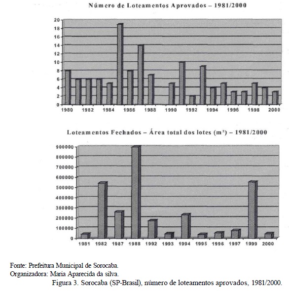 Ressaltamos, ainda, Sorocaba que é considerada por nós uma típica cidade média, ainda que se intensifiquem suas relações com a metrópole paulista. A Figura 3 que contém os gráficos de evolução do número de loteamentos implantados no período analisado é apresentado, como exemplo, para chamar atenção do leitor para o fato de que, entre 1988 e 1999, há anos em que houve diminuição de empreendimentos fundiários, mas, ao mesmo tempo, aumento da área implantada como loteamentos fechados que se constituem em forma de habitai urbano voltada para os segmentos de maior poder aquisitivo.