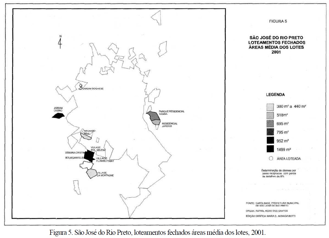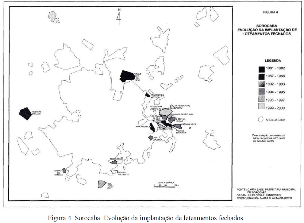Em primeiro lugar, a localização desses loteamentos é, no geral, periférica, exigindo o repensar do significado conceituai do próprio conceito de periferia urbana que está associado, nas cidades brasileiras, à pobreza e à precariedade de meios de consumo coletivo (infraestruturas, equipamentos e serviços urbanos). As Figuras 4 e 5 expressam, de forma bastante didática, a evolução da implantação dos loteamentos em duas cidades -Sorocaba e São José do Rio Preto- e a localização deles em relação ao conjunto do tecido urbano. Esses cartogramas ajudam a mostrar que a localização periférica é, contudo, também concentrada, ou seja, eles não se encontram em todo o "anel" periférico urbano, mas em setores dessa periferia que são os melhor equipados.